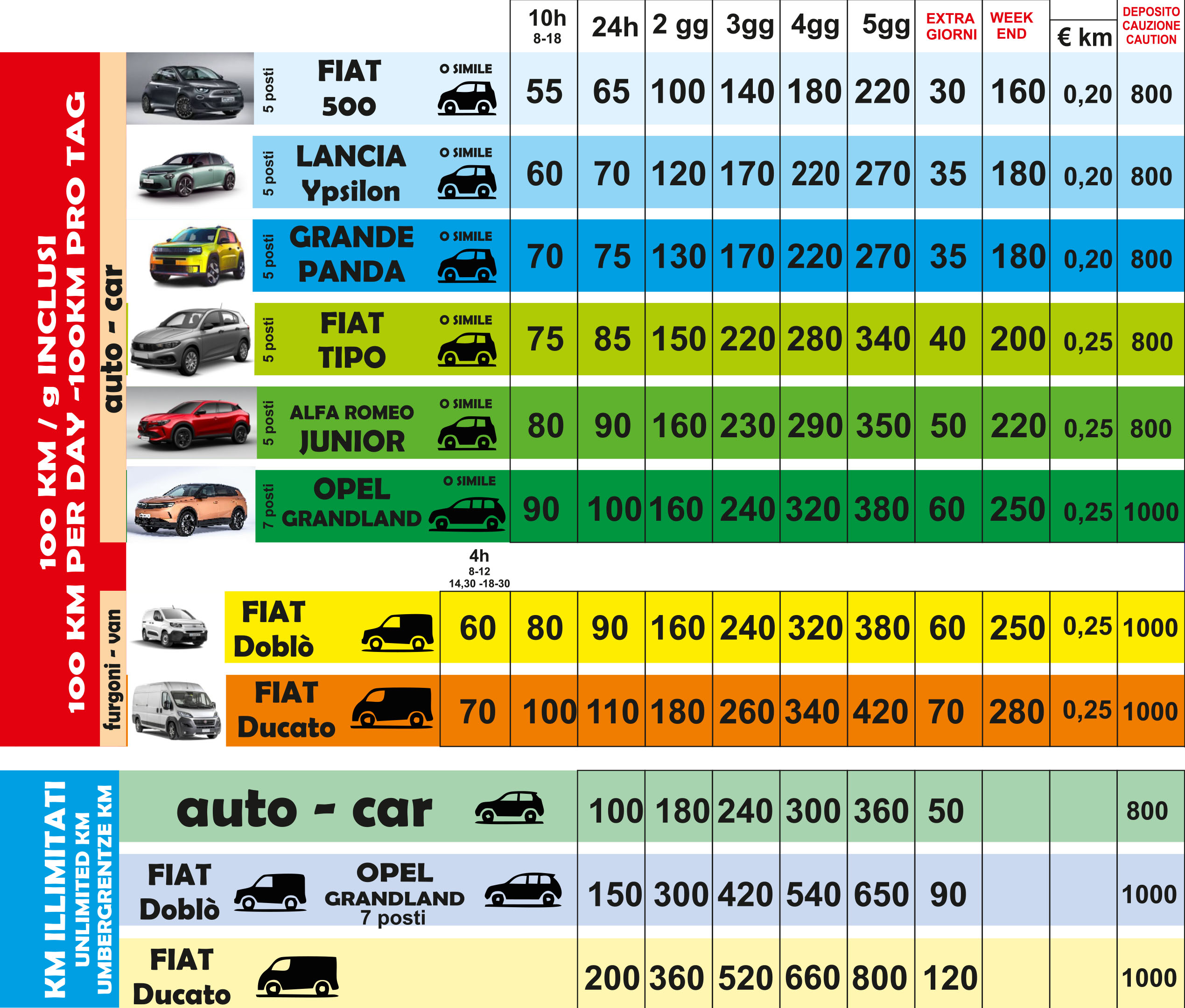 Ogni noleggio include 100 Km/giorno, con possibilità di chilometraggio illimitato.